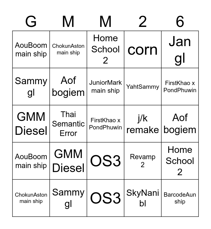 This bingo card has 50 words: BarcodeAun ship, FirstKhao x PondPhuwin, DewTee bl, OS3, GMM Diesel, ABO, ChokunAston main ship, animacja z pluszakami, Sammy gl, MarkOhm but please be good this time, Aof bogiem, corn, Home School 2, Revamp 2, Nanon gay again/WinNanon bl, The Joylada gang (+GeminiFourth), JuniorMark main ship, j/k remake, LYKN bl, Jan gl, Thai Semantic Error, SkyNani bl, AouBoom main ship, YahtSammy, Saint GMM, BarcodeAun ship, FirstKhao x PondPhuwin, animacja z pluszakami, Home School 2, OS3, ABO, Revamp 2, j/k remake, The Joylada gang(+GeminiFourth), Sammy gl, YahtSammy, SkyNani bl, DewTee bl, Thai Semantic Error, Aof bogiem, Jan gl, Nanon gay again/WinNanon bl, corn, JuniorMark main ship, ChokunAston main ship, GMM Diesel, MarkOhm but please be good this time, LYKN bl, AouBoom main ship and Saint GMM.