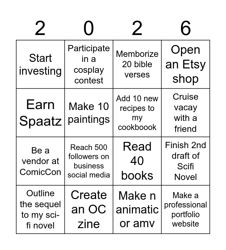 This bingo card has 16 words: Create an OC zine, Finish 2nd draft of Scifi Novel, Memborize 20 bible verses, Start investing, Be a vendor at ComicCon, Participate in a cosplay contest, Read 40 books, Make n animatic or amv, Earn Spaatz, Make 10 paintings, Outline the sequel to my sci-fi novel, Open an Etsy shop, Reach 500 followers on business social media, Cruise vacay with a friend, Add 10 new recipes to my cookboook and Make a professional portfolio website.