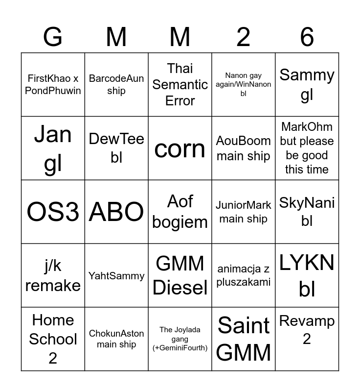 This bingo card has 25 words: YahtSammy, The Joylada gang (+GeminiFourth), corn, Home School 2, Sammy gl, FirstKhao x PondPhuwin, Jan gl, BarcodeAun ship, JuniorMark main ship, GMM Diesel, AouBoom main ship, OS3, animacja z pluszakami, LYKN bl, DewTee bl, Revamp 2, SkyNani bl, Thai Semantic Error, MarkOhm but please be good this time, ABO, Aof bogiem, ChokunAston main ship, j/k remake, Nanon gay again/WinNanon bl and Saint GMM.