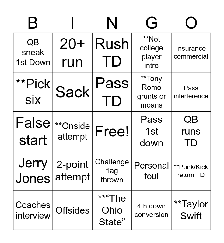 This bingo card has a free space and 34 words: 3rd down conversion, 4th down conversion, Takeaway, “This is the end of…”, Jerry Jones, Sack, Insurance commercial, Coaches interview, 20+ run, 30+ pass, Pass TD, Rush TD, Enter blue tent, Rush 1st down, Pass 1st down, Pass interference, Offsides, False start, 2-point attempt, Personal foul, Challenge flag thrown, Penalty flag thrown, QB sneak 1st Down, QB runs TD, **“The Ohio State”, **Taylor Swift, **Not college player intro, **3 Different Peyton Commercials, **Tony Romo grunts or moans, **Pick six, **Missed FG/PAT, **Onside attempt, **Punk/Kick return TD and **“Last time out..”.