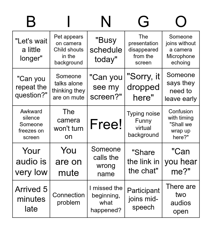 This bingo card has a free space and 24 words: You are on mute, Connection problem, "Can you see my screen?", Arrived 5 minutes late, Someone joins without a camera Microphone echoing, "Let's wait a little longer", "Can you repeat the question?", Pet appears on camera Child shouts in the background, Typing noise Funny virtual background, Someone calls the wrong name, "Sorry, it dropped here", Awkward silence Someone freezes on screen, "Share the link in the chat", "Can you hear me?", Someone talks alone thinking they are on mute, Participant joins mid-speech, Confusion with timing "Shall we wrap up here?", "Busy schedule today", Someone says they need to leave early, The camera won't turn on, There are two audios open, Your audio is very low, The presentation disappeared from the screen and I missed the beginning, what happened?.