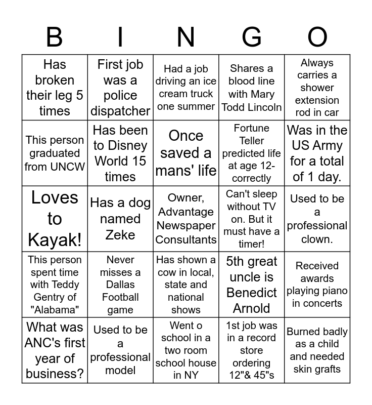 This bingo card has a free space and 24 words: Never misses a Dallas Football game, Used to be a professional model, Once saved a mans' life, What was ANC's first year of business?, Always carries a shower extension rod in car, Has broken their leg 5 times, This person graduated from UNCW, First job was a police dispatcher, Can't sleep without TV on. But it must have a timer!, Has shown a cow in local, state and national shows, Fortune Teller predicted life at age 12-correctly, Loves to Kayak!, 5th great uncle is Benedict Arnold, Received awards playing piano in concerts, Has been to Disney World 15 times, 1st job was in a record store ordering 12"& 45"s, Used to be a professional clown., Had a job driving an ice cream truck one summer, Was in the US Army for a total of 1 day., Has a dog named Zeke, Burned badly as a child and needed skin grafts, This person spent time with Teddy Gentry of "Alabama", Shares a blood line with Mary Todd Lincoln and Went o school in a two room school house in NY.