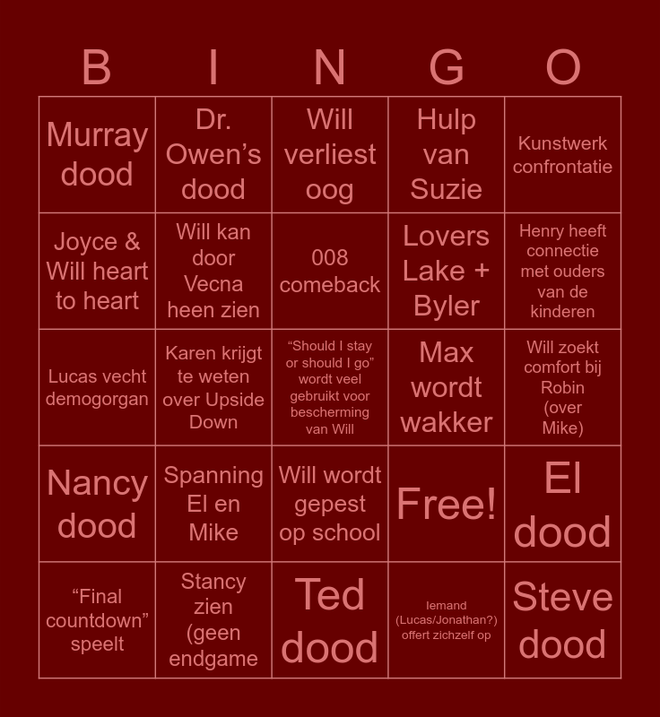 This bingo card has 25 words: Spanning El en Mike, Ted dood, 008 comeback, “Final countdown” speelt, Kunstwerk confrontatie, Murray dood, Joyce & Will heart to heart, Dr. Owen’s dood, Max wordt wakker, Will wordt gepest op school, Lovers Lake + Byler, Lucas vecht demogorgan, Free!, El dood, Will kan door Vecna heen zien, Steve dood, Will zoekt comfort bij Robin (over Mike), Will verliest oog, Henry heeft connectie met ouders van de kinderen, Karen krijgt te weten over Upside Down, “Should I stay or should I go” wordt veel gebruikt voor bescherming van Will, Stancy zien (geen endgame, Nancy dood, Hulp van Suzie and Iemand (Lucas/Jonathan?) offert zichzelf op.