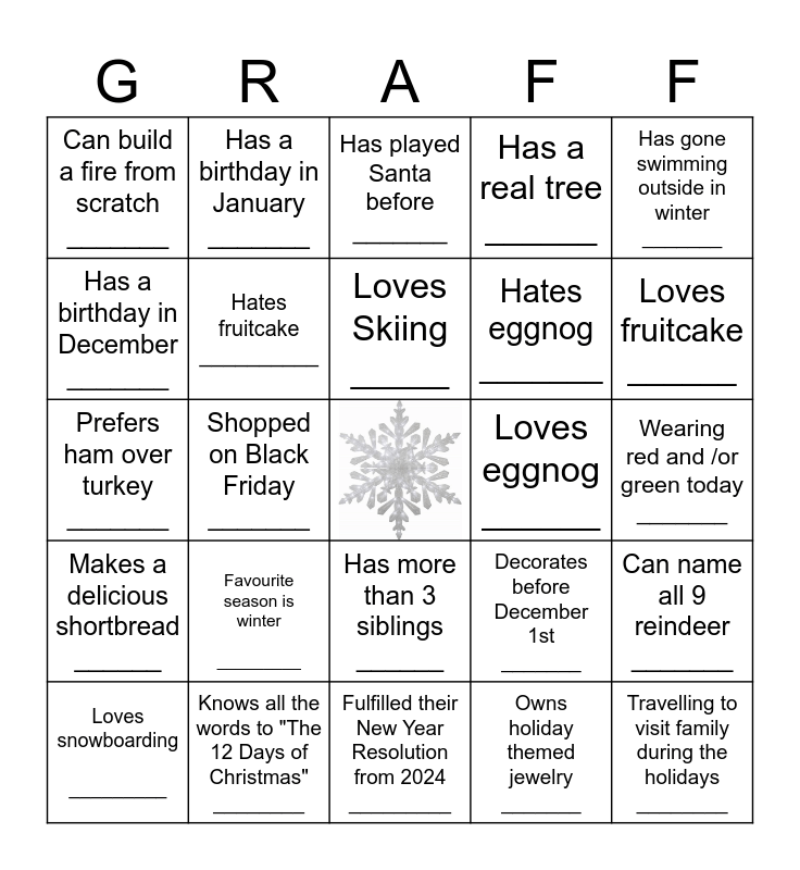 This bingo card has a free space and 24 words: Favourite season is winter _________, Knows all the words to "The 12 Days of Christmas" ________, Loves Skiing _____, Loves snowboarding _________, Has gone swimming outside in winter _______, Can build a fire from scratch _______, Has a birthday in December _______, Has a birthday in January _______, Loves eggnog ______, Has more than 3 siblings ______, Hates eggnog _______, Prefers ham over turkey _______, Decorates before December 1st _______, Can name all 9 reindeer _______, Hates fruitcake __________, Owns holiday themed jewelry _______, Wearing red and /or green today _______, Has played Santa before _______, Loves fruitcake ______, Shopped on Black Friday _______, Travelling to visit family during the holidays ________, Makes a delicious shortbread ______, Has a real tree ______ and Fulfilled their New Year Resolution from 2024 _________.