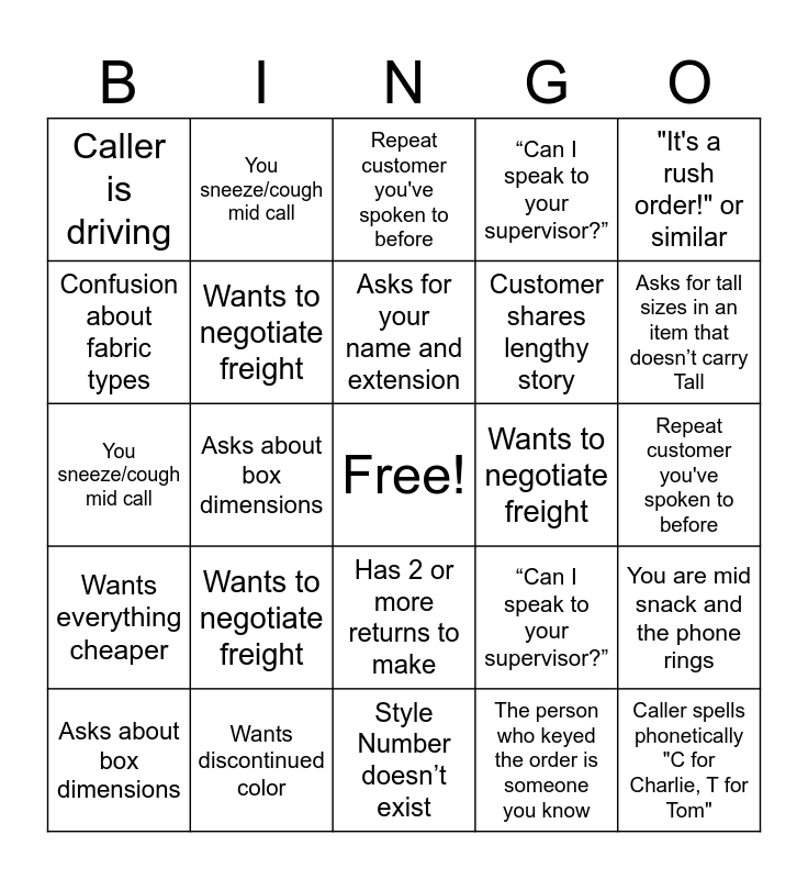 This bingo card has a free space and 124 words: Caller spells phonetically "C for Charlie T for Tom", Wants to put the order on hold (CWCB), Asks for your name and extension, “Can I speak to your supervisor?”, Return & was Pulled Short, Has 2 or more returns to make, Wants everything cheaper, Asks for tall sizes in an item that doesn’t carry Tall, The person who keyed the order is someone you know, Confusion about fabric types, Catalog/Swatch Book request, Wants to edit their order, Restock ETA request, Figures out what they need before you can help, Dog barking (Yours or theirs), Doesn't know their account number, Wants discontinued color, Customer explains business story, Customer sounds like someone you know, Style Number doesn’t exist, You say “Goodbye” more than once, You sneeze/cough mid call, Caller is a repeat customer of yours, Caller spells phonetically "C for Charlie, T for Tom", Trouble logging in, Asks for your name and extension, “Can I speak to your supervisor?”, Return was pulled short, Has 2 or more returns to make, Wants everything cheaper, You are mid snack and the phone rings, Asks for tall sizes in an item that doesn’t carry Tall, Asks about box dimensions, Wants to negotiate freight, Confusion about fabric types, Swatch Book / Catalog Order, Uses phone number to look up account, Restock ETA request, Figures out what they need before you can help them, Dog barking (Yours or Theirs), Caller is driving, Has 2 or more returns to make, Customer explains business/life/personal story, Repeat customer you've spoken to before, Style Number doesn’t exist, You say “Goodbye” more than once, You sneeze/cough mid call, "It's a rush order!" or similar, Caller spells phonetically "C for Charlie, T for Tom", Trouble logging in, Asks for your name and extension, “Can I speak to your supervisor?”, Return was pulled short, THANKFUL FOR YOU!! FREE SPACE 2, Has 2 or more returns to make, Wants everything cheaper, You are mid snack and the phone rings, Asks for tall sizes in an item that doesn’t carry Tall, Asks about box dimensions, Wants to negotiate freight, Confusion about fabric types, Swatch Book / Catalog Order, Uses phone number to look up account, Restock ETA request, Figures out what they need before you can help them, Dog barking (Yours or Theirs), Caller is driving, Has 2 or more returns to make, Customer shares lengthy story, Repeat customer you've spoken to before, Style Number doesn’t exist, You say “Goodbye” more than once, You sneeze/cough mid call, "It's a rush order!" or similar, Caller spells phonetically "C for Charlie, T for Tom", Asks for your name and extension, “Can I speak to your supervisor?”, Return was pulled short, THANKFUL FOR YOU!! FREE SPACE 2, Has 2 or more returns to make, Wants everything cheaper, You are mid snack and the phone rings, Asks for tall sizes in an item that doesn’t carry Tall, Asks about box dimensions, Wants to negotiate freight, Confusion about fabric types, Swatch Book / Catalog Order, Uses phone number to look up account, Restock ETA request, Figures out what they need before you can help them, Dog barking (Yours or Theirs), Caller is driving, Has 2 or more returns to make, Customer shares lengthy story, Repeat customer you've spoken to before, Style Number doesn’t exist, You say “Goodbye” more than once, You sneeze/cough mid call, "It's a rush order!" or similar, Caller spells phonetically "C for Charlie, T for Tom", Asks for your name and extension, “Can I speak to your supervisor?”, Return was pulled short, THANKFUL FOR YOU!! FREE SPACE 2, Has 2 or more returns to make, Wants everything cheaper, You are mid snack and the phone rings, Asks for tall sizes in an item that doesn’t carry Tall, Asks about box dimensions, Wants to negotiate freight, Confusion about fabric types, Swatch Book / Catalog Order, Uses phone number to look up account, Restock ETA request, Figures out what they need before you can help them, Dog barking (Yours or Theirs), Caller is driving, Has 2 or more returns to make, Customer shares lengthy story, Repeat customer you've spoken to before, Style Number doesn’t exist, You say “Goodbye” more than once, You sneeze/cough mid call and "It's a rush order!" or similar.