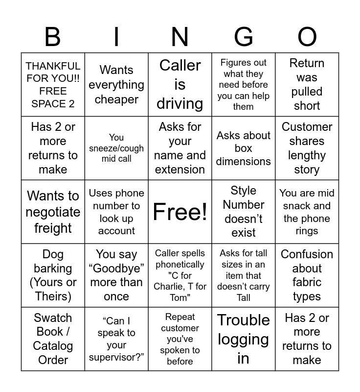 This bingo card has a free space and 26 words: Caller spells phonetically "C for Charlie, T for Tom", Trouble logging in, Asks for your name and extension, “Can I speak to your supervisor?”, Return was pulled short, THANKFUL FOR YOU!! FREE SPACE 2, Has 2 or more returns to make, Wants everything cheaper, You are mid snack and the phone rings, Asks for tall sizes in an item that doesn’t carry Tall, Asks about box dimensions, Wants to negotiate freight, Confusion about fabric types, Swatch Book / Catalog Order, Uses phone number to look up account, Restock ETA request, Figures out what they need before you can help them, Dog barking (Yours or Theirs), Caller is driving, Has 2 or more returns to make, Customer shares lengthy story, Repeat customer you've spoken to before, Style Number doesn’t exist, You say “Goodbye” more than once, You sneeze/cough mid call and "It's a rush order!" or similar.