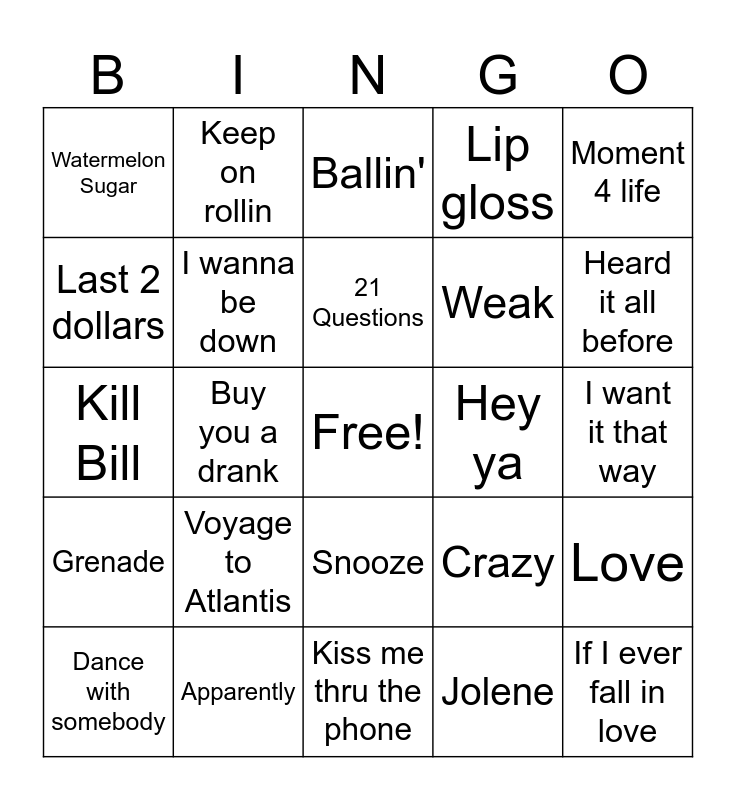 This bingo card has a free space and 38 words: Is it a crime, Ordinary Guy, When I see you, Hey ya, Love, Grenade, Buy you a drank, Happy, Weak, Heard it all before, Last 2 dollars, I wanna be down, Jolene, I want it that way, Watermelon Sugar, Voyage to Atlantis, cause I love you, Lip gloss, Crazy in love, Kill Bill, Keep on rollin, Kiss me thru the phone, Crazy, If I ever fall in love, Number One, Hold onto your love, Snooze, That's what I like, Still into you, Shisha, Smooth Criminal, 21 Questions, Bedrock, Moment 4 life, Dance with somebody, Apparently, Ballin' and Complicated.