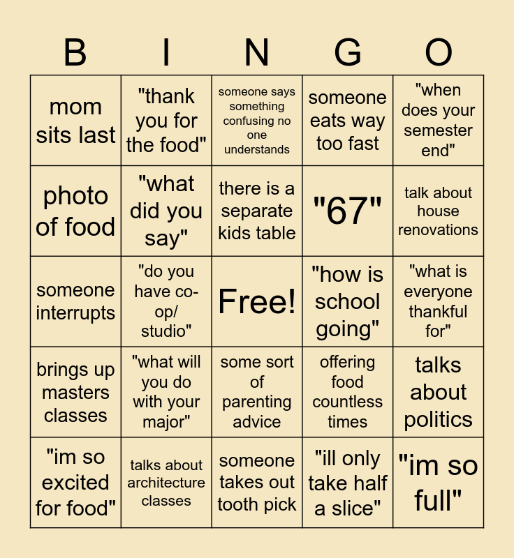 This bingo card has a free space and 24 words: "im so excited for food", "what will you do with your major", there is a separate kids table, "ill only take half a slice", "when does your semester end", mom sits last, "thank you for the food", someone says something confusing no one understands, "how is school going", "what is everyone thankful for", someone interrupts, "what did you say", offering food countless times, talks about politics, photo of food, talks about architecture classes, someone takes out tooth pick, someone eats way too fast, talk about house renovations, brings up masters classes, "do you have co-op/ studio", some sort of parenting advice, "67" and "im so full".