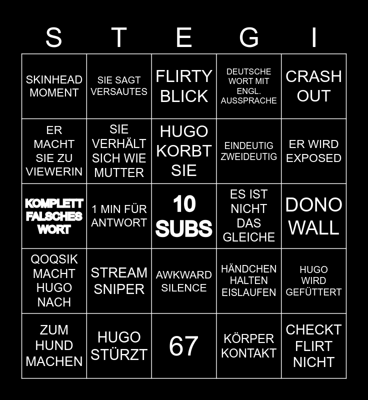This bingo card has a free space and 24 words: STREAM SNIPER, HUGO STÜRZT, HUGO KORBT SIE, ZUM HUND MACHEN, CRASH OUT, SKINHEAD MOMENT, ER MACHT SIE ZU VIEWERIN, SIE SAGT VERSAUTES, ES IST NICHT DAS GLEICHE, AWKWARD SILENCE, EINDEUTIG ZWEIDEUTIG, KOMPLETT FALSCHES WORT, HÄNDCHEN HALTEN EISLAUFEN, HUGO WIRD GEFÜTTERT, SIE VERHÄLT SICH WIE MUTTER, KÖRPER KONTAKT, DONO WALL, FLIRTY BLICK, ER WIRD EXPOSED, 1 MIN FÜR ANTWORT, CHECKT FLIRT NICHT, QOQSIK MACHT HUGO NACH, DEUTSCHE WORT MIT ENGL. AUSSPRACHE and 67.
