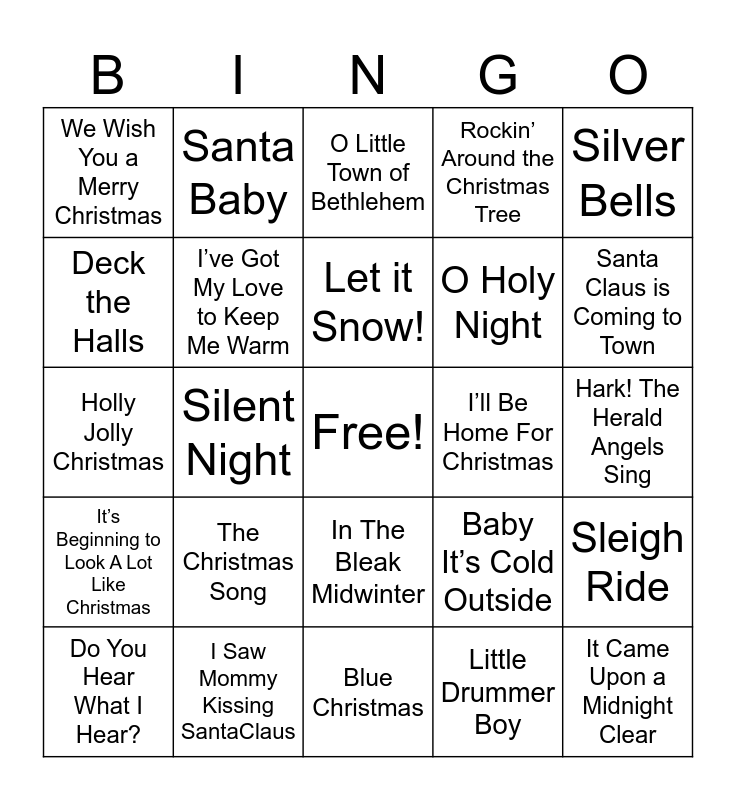 This bingo card has a free space and 36 words: Winter Wonderland, Frosty the Snowman, Here Comes Santa Claus, I’ve Got My Love to Keep Me Warm, Baby It’s Cold Outside, It’s Beginning to Look A Lot Like Christmas, Let it Snow!, White Christmas, Silver Bells, Jingle Bell Rock, Silent Night, Rockin’ Around the Christmas Tree, Have Yourself a Merry Little Christmas, I’ll Be Home For Christmas, Santa Claus is Coming to Town, We Wish You a Merry Christmas, The First Noel, The Christmas Song, It Came Upon a Midnight Clear, O Little Town of Bethlehem, Hark! The Herald Angels Sing, Sleigh Ride, I Saw Mommy Kissing SantaClaus, Do You Hear What I Hear?, Blue Christmas, Santa Baby, Holly Jolly Christmas, It’s The Most Wonderful Time of the Year, O Holy Night, Deck the Halls, Run Rudolph Run, Happy Holiday, Little Drummer Boy, In The Bleak Midwinter, Rudolph the Red Nosed Reindeer and Feliz Navidad.