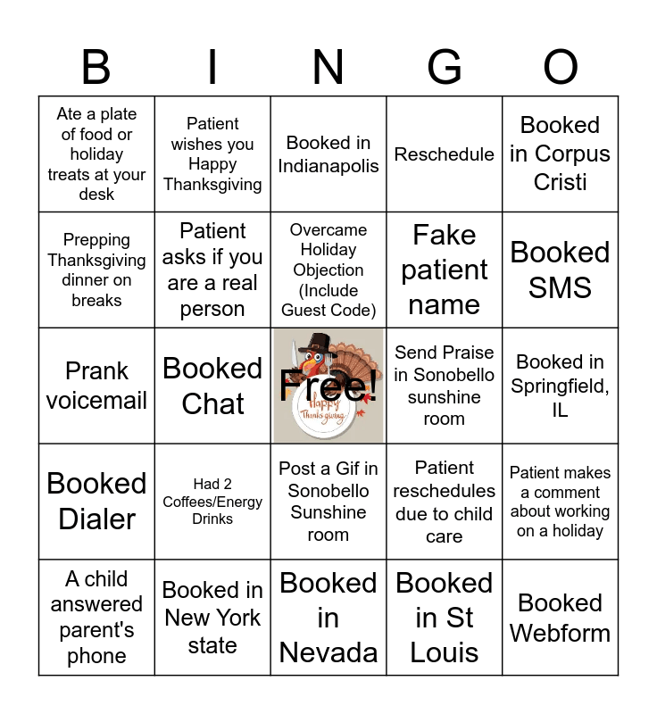 This bingo card has a free space and 24 words: Had 2 Coffees/Energy Drinks, Booked in New York state, Overcame Holiday Objection (Include Guest Code), A child answered parent's phone, Booked in Corpus Cristi, Ate a plate of food or holiday treats at your desk, Prepping Thanksgiving dinner on breaks, Patient wishes you Happy Thanksgiving, Send Praise in Sonobello sunshine room, Post a Gif in Sonobello Sunshine room, Fake patient name, Prank voicemail, Patient reschedules due to child care, Patient makes a comment about working on a holiday, Patient asks if you are a real person, Booked in St Louis, Booked in Springfield, IL, Booked in Indianapolis, Booked SMS, Booked Chat, Booked Webform, Booked Dialer, Reschedule and Booked in Nevada.