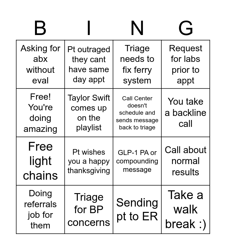 This bingo card has 16 words: Triage for BP concerns, Call about normal results, Triage needs to fix ferry system, Asking for abx without eval, Free light chains, Pt outraged they cant have same day appt, GLP-1 PA or compounding message, Sending pt to ER, Free! You're doing amazing, Taylor Swift comes up on the playlist, Doing referrals job for them, Request for labs prior to appt, Pt wishes you a happy thanksgiving, You take a backline call, Call Center doesn't schedule and sends message back to triage and Take a walk break :).