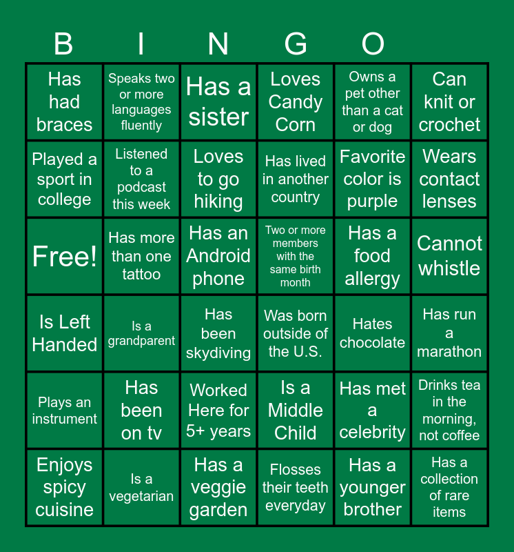 This bingo card has 36 words: Is a Middle Child, Worked Here for 5+ years, Flosses their teeth everyday, Played a sport in college, Is Left Handed, Two or more members with the same birth month, Listened to a podcast this week, Has a veggie garden, Owns a pet other than a cat or dog, Has met a celebrity, Wears contact lenses, Loves Candy Corn, Drinks tea in the morning, not coffee, Has more than one tattoo, Has lived in another country, Has had braces, Plays an instrument, Has a food allergy, Free!, Has a sister, Has an Android phone, Is a grandparent, Was born outside of the U.S., Has been skydiving, Hates chocolate, Speaks two or more languages fluently, Favorite color is purple, Is a vegetarian, Loves to go hiking, Can knit or crochet, Has a collection of rare items, Enjoys spicy cuisine, Has run a marathon, Cannot whistle, Has been on tv and Has a younger brother.