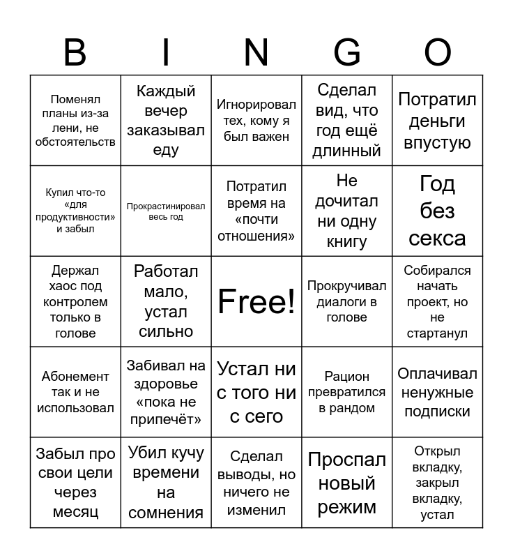 This bingo card has a free space and 32 words: Проспал новый режим, Слил дедлайны, Работал мало, устал сильно, Купил курс и не открыл, Абонемент так и не использовал, Прокрастинировал весь год, Потратил деньги впустую, Оплачивал ненужные подписки, Каждый вечер заказывал еду, Влюбился не в того человека, Потратил время на «почти отношения», Игнорировал тех, кому я был важен, Тянулся к тем, кому всё равно, Молчал вместо разговора, Прокручивал диалоги в голове, Фантазировал вместо действий, Забыл про свои цели через месяц, Держал хаос под контролем только в голове, Устал ни с того ни с сего, Забивал на здоровье «пока не припечёт», Рацион превратился в рандом, Болтался между задачами без результата, Собирался начать проект, но не стартанул, Убил кучу времени на сомнения, Открыл вкладку, закрыл вкладку, устал, Сделал вид, что год ещё длинный, Не дочитал ни одну книгу, Купил что-то «для продуктивности» и забыл, Поменял планы из-за лени, не обстоятельств, Сделал выводы, но ничего не изменил, Обещал себе начать — не начал and Год без секса.