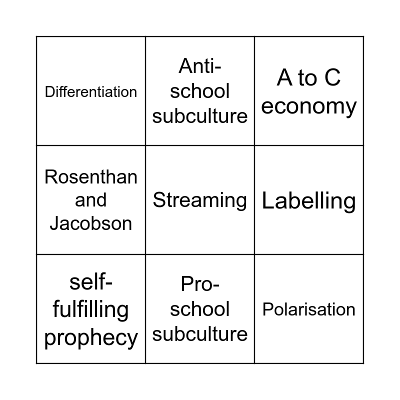 This bingo card has a free space and 8 words: Labelling, A to C economy, Anti-school subculture, self-fulfilling prophecy, Differentiation, Polarisation, Rosenthan and Jacobson and Pro-school subculture.
