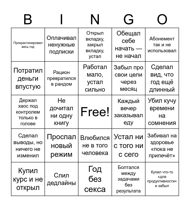 This bingo card has a free space and 24 words: Проспал новый режим, Слил дедлайны, Работал мало, устал сильно, Купил курс и не открыл, Абонемент так и не использовал, Прокрастинировал весь год, Потратил деньги впустую, Оплачивал ненужные подписки, Каждый вечер заказывал еду, Влюбился не в того человека, Забыл про свои цели через месяц, Держал хаос под контролем только в голове, Устал ни с того ни с сего, Забивал на здоровье «пока не припечёт», Рацион превратился в рандом, Болтался между задачами без результата, Убил кучу времени на сомнения, Открыл вкладку, закрыл вкладку, устал, Сделал вид, что год ещё длинный, Не дочитал ни одну книгу, Купил что-то «для продуктивности» и забыл, Сделал выводы, но ничего не изменил, Обещал себе начать — не начал and Год без секса.