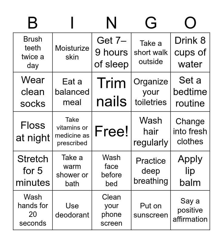 This bingo card has a free space and 24 words: Wash hands for 20 seconds, Take a warm shower or bath, Trim nails, Put on sunscreen, Drink 8 cups of water, Brush teeth twice a day, Moisturize skin, Get 7–9 hours of sleep, Wash hair regularly, Change into fresh clothes, Floss at night, Eat a balanced meal, Practice deep breathing, Apply lip balm, Wear clean socks, Use deodorant, Clean your phone screen, Take a short walk outside, Set a bedtime routine, Stretch for 5 minutes, Take vitamins or medicine as prescribed, Wash face before bed, Organize your toiletries and Say a positive affirmation.