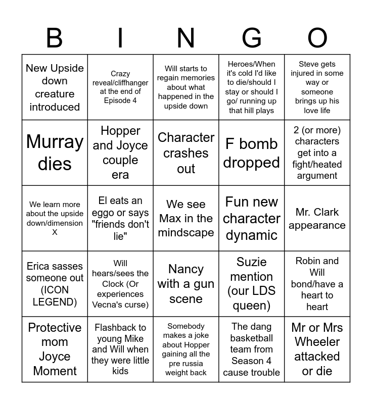 This bingo card has 25 words: Will hears/sees the Clock (Or experiences Vecna's curse), Somebody makes a joke about Hopper gaining all the pre russia weight back, Character crashes out, Protective mom Joyce Moment, Steve gets injured in some way or someone brings up his love life, New Upside down creature introduced, Murray dies, Crazy reveal/cliffhanger at the end of Episode 4, Fun new character dynamic, Nancy with a gun scene, F bomb dropped, We learn more about the upside down/dimension X, Suzie mention (our LDS queen), Robin and Will bond/have a heart to heart, Hopper and Joyce couple era, Mr or Mrs Wheeler attacked or die, Mr. Clark appearance, Will starts to regain memories about what happened in the upside down, 2 (or more) characters get into a fight/heated argument, El eats an eggo or says "friends don't lie", We see Max in the mindscape, Flashback to young Mike and Will when they were little kids, Erica sasses someone out (ICON LEGEND), Heroes/When it's cold I'd like to die/should I stay or should I go/ running up that hill plays and The dang basketball team from Season 4 cause trouble.