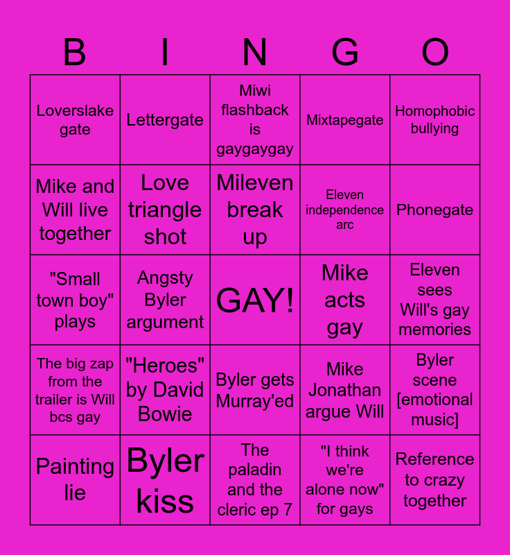 This bingo card has a free space and 24 words: "Heroes" by David Bowie, Byler kiss, Mileven break up, Painting lie, Homophobic bullying, Loverslake gate, Mike and Will live together, Lettergate, Mike acts gay, Byler gets Murray'ed, Eleven independence arc, "Small town boy" plays, Mike Jonathan argue Will, Byler scene [emotional music], Love triangle shot, "I think we're alone now" for gays, Eleven sees Will's gay memories, Miwi flashback is gaygaygay, Phonegate, Angsty Byler argument, Reference to crazy together, The big zap from the trailer is Will bcs gay, Mixtapegate and The paladin and the cleric ep 7.