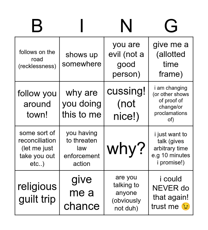 This bingo card has 16 words: give me a chance, i just want to talk (gives arbitrary time e.g 10 minutes i promise!), you are evil (not a good person), follows on the road (recklessness), some sort of reconciliation (let me just take you out etc..), shows up somewhere, why?, are you talking to anyone (obviously not duh), follow you around town!, why are you doing this to me, religious guilt trip, give me a (allotted time frame), you having to threaten law enforcement action, i am changing (or other shows of proof of change/or proclamations of), cussing! (not nice!) and i could NEVER do that again! trust me 😉.