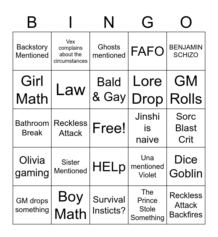This bingo card has a free space and 24 words: Sister Mentioned, Boy Math, Bald & Gay, GM drops something, BENJAMIN SCHIZO, Backstory Mentioned, Girl Math, Vex complains about the circumstances, Jinshi is naive, HELp, Lore Drop, Bathroom Break, Una mentioned Violet, Dice Goblin, Law, The Prince Stole Something, Sorc Blast Crit, Ghosts mentioned, GM Rolls, Reckless Attack, Reckless Attack Backfires, Olivia gaming, FAFO and Survival Insticts?.
