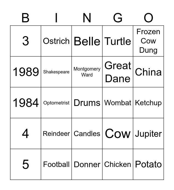 This bingo card has 25 words: 4, Football, Drums, Chicken, Frozen Cow Dung, 3, Ostrich, Belle, Wombat, Jupiter, 1989, Shakespeare, Donner, Cow, China, 5, Optometrist, Montgomery Ward, Great Dane, Ketchup, 1984, Reindeer, Candles, Turtle and Potato.