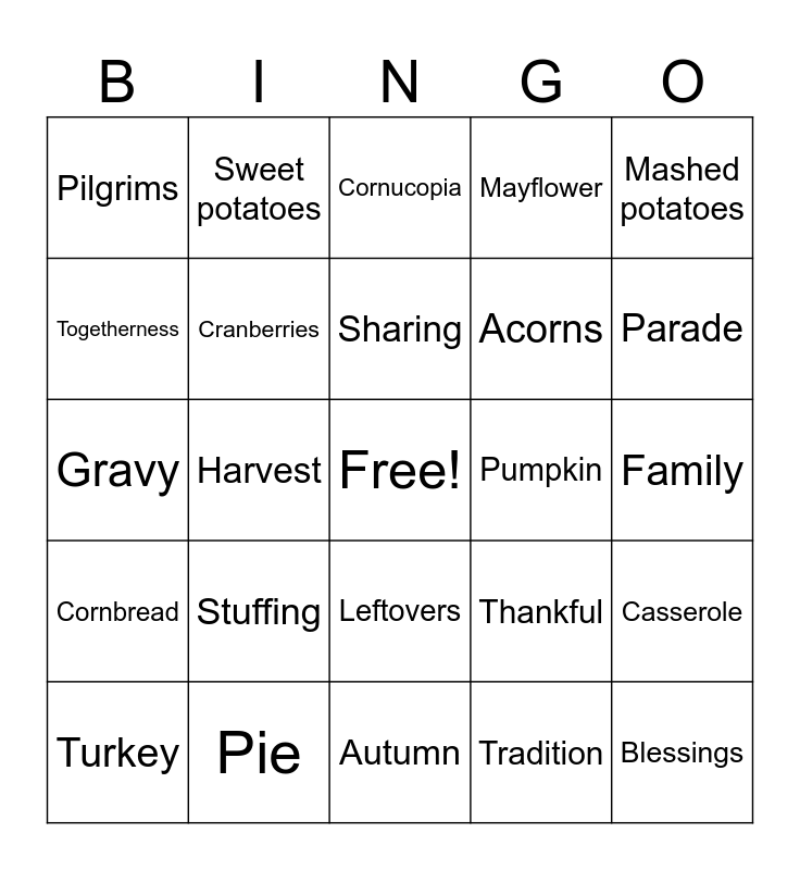 This bingo card has a free space and 29 words: Turkey, Gratitude, Harvest, Feast, Pilgrims, Cornucopia, Cranberries, Stuffing, Pumpkin, Pie, Family, Blessings, Autumn, Tradition, Parade, Gathering, Leftovers, Cornbread, Mashed potatoes, Gravy, Thankful, Celebration, Acorns, Togetherness, Mayflower, Sweet potatoes, Casserole, Sharing and Orchard.