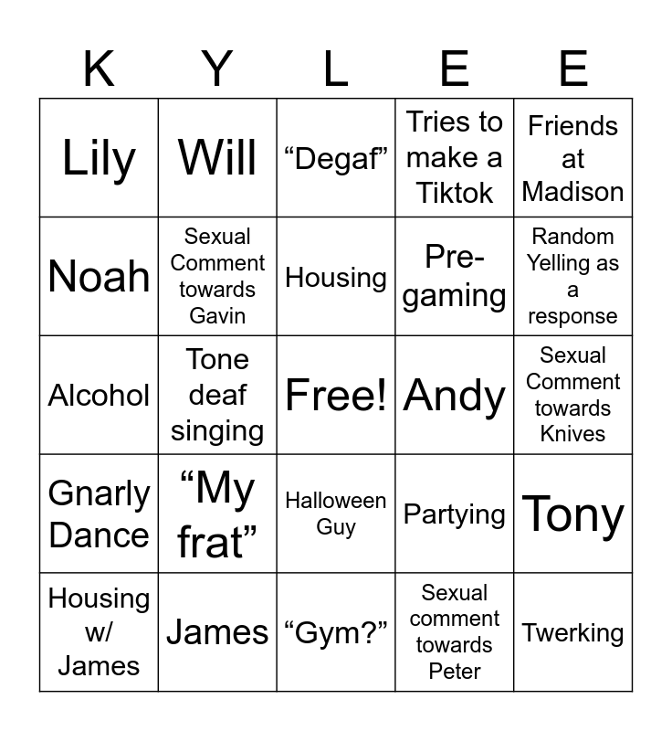 This bingo card has a free space and 24 words: “My frat”, James, Housing, Housing w/ James, Friends at Madison, Lily, Noah, Will, Andy, Halloween Guy, Pre-gaming, Alcohol, Partying, Tony, Sexual Comment towards Gavin, Sexual comment towards Peter, Sexual Comment towards Knives, “Degaf”, Random Yelling as a response, Tone deaf singing, Twerking, Gnarly Dance, Tries to make a Tiktok and “Gym?”.