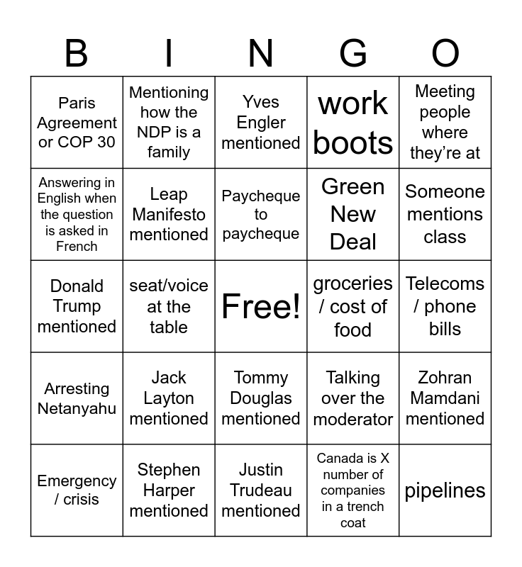 This bingo card has a free space and 24 words: Jack Layton mentioned, Stephen Harper mentioned, Paycheque to paycheque, Emergency / crisis, Meeting people where they’re at, Paris Agreement or COP 30, Answering in English when the question is asked in French, Mentioning how the NDP is a family, groceries / cost of food, Tommy Douglas mentioned, Green New Deal, Donald Trump mentioned, Talking over the moderator, Zohran Mamdani mentioned, Leap Manifesto mentioned, Canada is X number of companies in a trench coat, Telecoms / phone bills, Yves Engler mentioned, Someone mentions class, seat/voice at the table, pipelines, Arresting Netanyahu, work boots and Justin Trudeau mentioned.