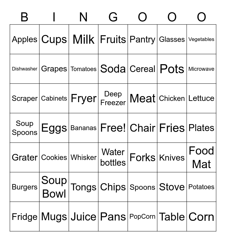 This bingo card has a free space and 48 words: Spoons, Pots, Pans, Eggs, Fryer, Plates, Cups, Mugs, Glasses, Water bottles, Vegetables, Fruits, Chicken, Meat, Burgers, Fries, Dishwasher, Microwave, Stove, Pantry, Cereal, Bananas, Apples, Grapes, Potatoes, Tomatoes, Lettuce, Fridge, Deep Freezer, Cabinets, Table, Chair, Food Mat, Soup Bowl, Soup Spoons, Forks, Knives, Scraper, Whisker, Tongs, Grater, Corn, Milk, Juice, Soda, Chips, Cookies and PopCorn.