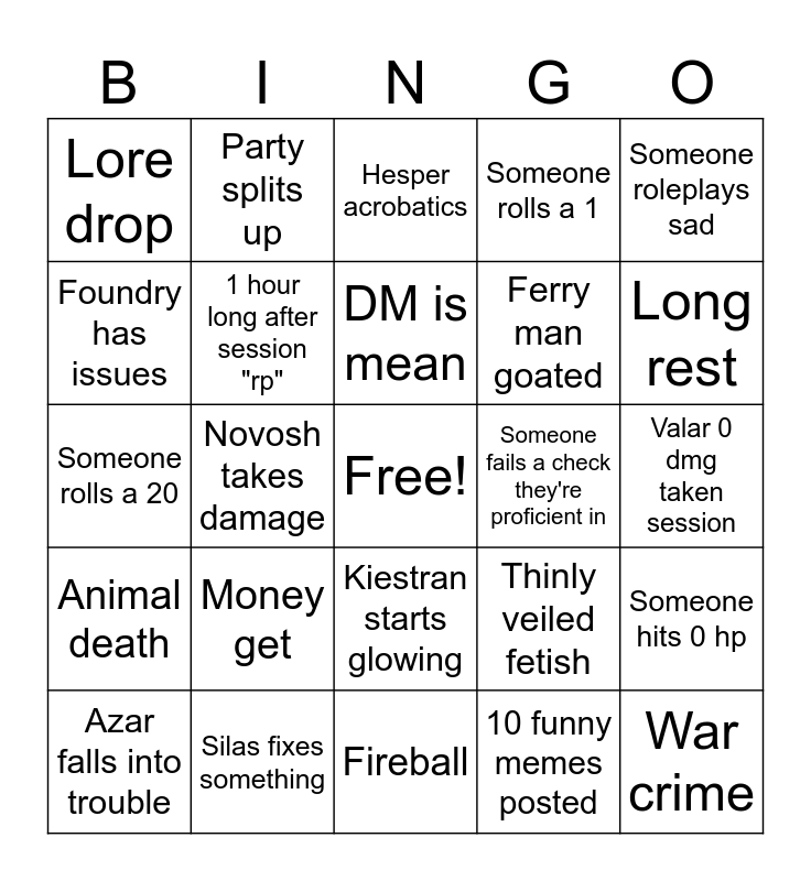 This bingo card has a free space and 24 words: Money get, Silas fixes something, DM is mean, Azar falls into trouble, Someone roleplays sad, Lore drop, Foundry has issues, Party splits up, Someone fails a check they're proficient in, Kiestran starts glowing, Ferry man goated, Someone rolls a 20, Thinly veiled fetish, Someone hits 0 hp, 1 hour long after session "rp", 10 funny memes posted, Valar 0 dmg taken session, Hesper acrobatics, Long rest, Novosh takes damage, War crime, Animal death, Someone rolls a 1 and Fireball.