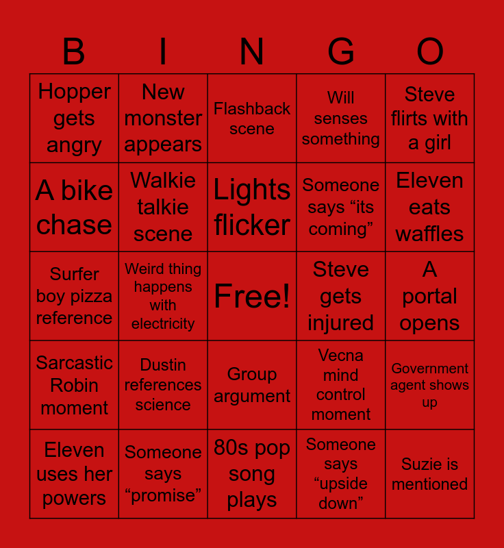 This bingo card has a free space and 24 words: Eleven uses her powers, Dustin references science, Lights flicker, Someone says “upside down”, Steve flirts with a girl, Hopper gets angry, New monster appears, Flashback scene, Steve gets injured, A portal opens, Surfer boy pizza reference, Walkie talkie scene, Vecna mind control moment, Government agent shows up, A bike chase, Someone says “promise”, 80s pop song plays, Will senses something, Eleven eats waffles, Sarcastic Robin moment, Weird thing happens with electricity, Group argument, Someone says “its coming” and Suzie is mentioned.