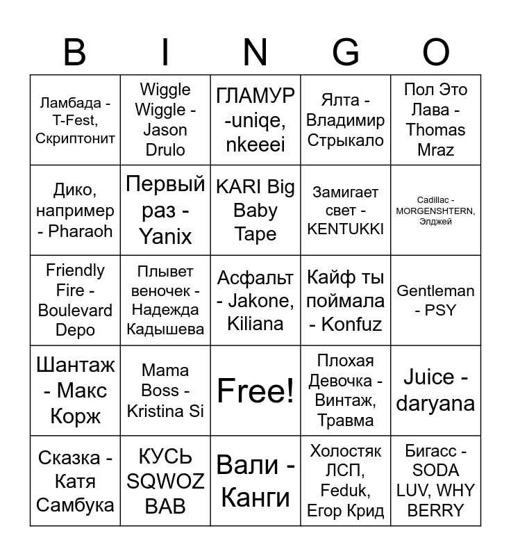 This bingo card has 26 words: Free!, Холостяк ЛСП, Feduk, Егор Крид, KARI Big Baby Tape, КУСЬ SQWOZ BAB, Пол Это Лава - Thomas Mraz, Ламбада - T-Fest, Скриптонит, Дико, например - Pharaoh, Wiggle Wiggle - Jason Drulo, Gentleman - PSY, Плохая Девочка - Винтаж, Травма, Замигает свет - KENTUKKI, Friendly Fire - Boulevard Depo, Juice - daryana, Сказка - Катя Самбука, Плывет веночек - Надежда Кадышева, Девочка пай – Михаил Кру, Ялта - Владимир Стрыкало, Шантаж - Макс Корж, ГЛАМУР -uniqe, nkeeei, Асфальт - Jakone, Kiliana, Cadillac - MORGENSHTERN, Элджей, Вали - Канги, Кайф ты поймала - Konfuz, Mama Boss - Kristina Si, Первый раз - Yanix and Бигасс - SODA LUV, WHY BERRY.