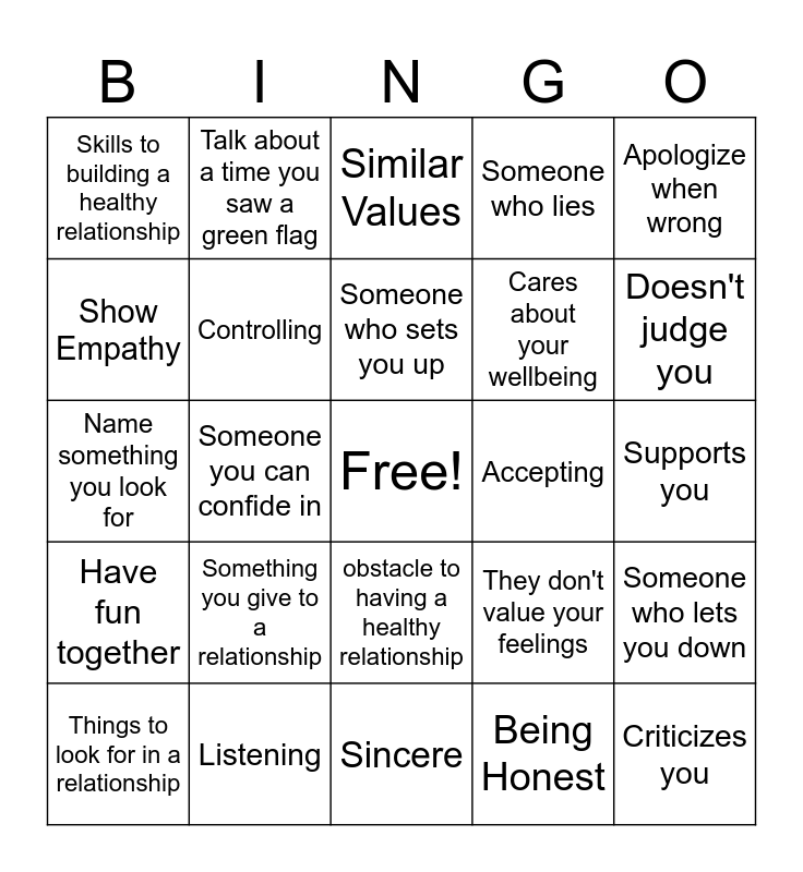 This bingo card has a free space and 29 words: Things to look for in a relationship, Red Flags, Someone you can confide in, Green Flags, Skills to building a healthy relationship, Similar Values, Controlling, Something you give to a relationship, Accepting, Listening, Supports you, Criticizes you, Sincere, Being Honest, Doesn't judge you, They talk behind your back, obstacle to having a healthy relationship, Have fun together, Apologize when wrong, Name something you look for, They don't value your feelings, Talk about a time you saw a red flag, Cares about your wellbeing, Show Empathy, Someone who lies, Talk about a time you saw a green flag, Someone who lets you down, Someone who sets you up and Someone you can confide in.