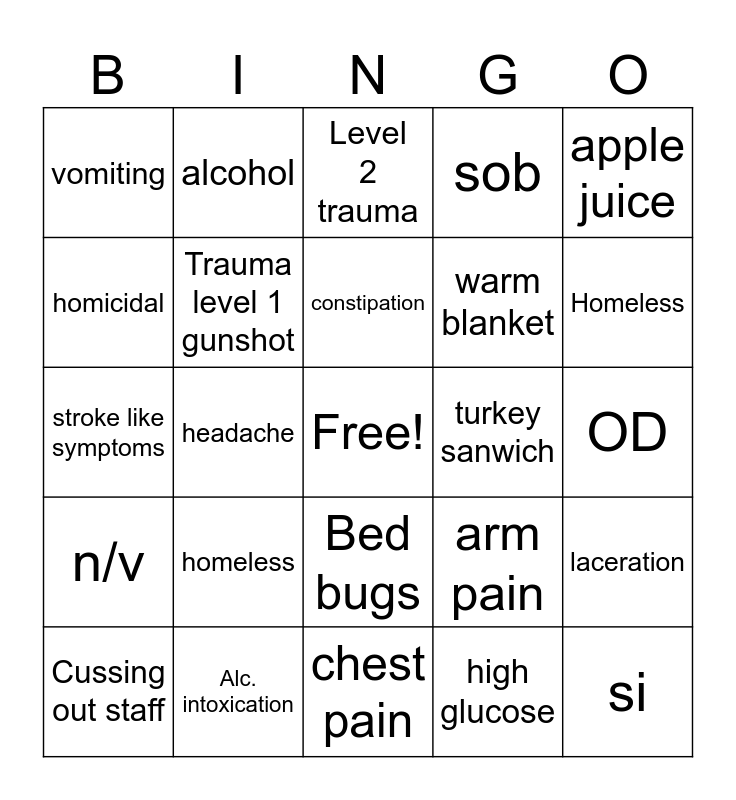 This bingo card has a free space and 49 words: std chk, si, vision problems, chest pain, homeless, request for yellow socks, alcohol, anxiety, homicidal, trauma level 2 fall, Trauma level 1 gunshot, sob, laceration, arm pain, hip pain, high bp, constipation, turkey sanwich, chap stick, apple juice, headache, high glucose, vomiting, warm blanket, Level 2 fall, Homeless, Cussing out staff, medic 8, Bed bugs, n/v, medic 15, warm blanket, dka, sepsis, Alc. intoxication, multiple family members @ bedside, FREE SPACE, SI, OD, STD, "I'm a hard stick", SOB, Cardiac arrest, soiled depends "code brown", stroke like symptoms, Level 2 trauma, request turkey sandwich sack lunch, Stemi alert and Jail-itis.
