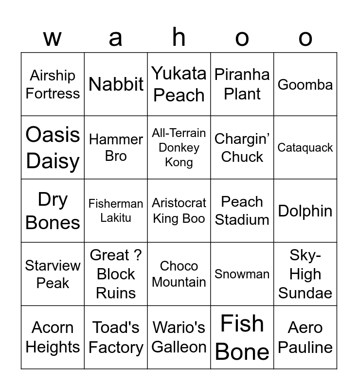 This bingo card has 76 words: Cowboy Mario, Mechanic Luigi, Yukata Peach, Food Slinger Yoshi, Biker Bowser, Engineer Toad, Conductor Toadette, Runner Koopa Troopa, Work Crew Wario, Wampire Waluigi, Aero Pauline, Pit Crew Shy Guy, All-Terrain Donkey Kong, Oasis Daisy, Touring Rosalina, Fisherman Lakitu, Vacation Birdo, Aristocrat King Boo, Explorer Bowser Jr., Goomba, Wiggler, Dry Bones, Hammer Bro, Nabbit, Piranha Plant, Sidestepper, Monty Mole, Stingby, Penguin, Cheep Cheep, Cow, Para-Biddybud, Pokey, Snowman, Cataquack, Chargin’ Chuck, Coin Coffer, Conkodor, Dolphin, Fish Bone, Peepa, Pianta, Rocky Wrench, Spike, Swoop, The babies that Nintendo love to put in most Mario Kart games, Acorn Heights, Airship Fortress, Boo Cinema, Bowser's Castle, Cheep Cheep Falls, Choco Mountain, Crown City, Dandelion Depths, Desert Hills, Dino Dino Jungle, DK Pass, DK Spaceport, Dry Bones Burnout, Faraway Oasis, Great ? Block Ruins, Koopa Troopa Beach, Mario Bros. Circuit, Mario Circuit (The SNES one), Moo Moo Meadows, Peach Beach, Peach Stadium, Rainbow Road, Salty Salty Speedway, Shy Guy Bazaar, Sky-High Sundae, Starview Peak, Toad's Factory, Wario Stadium, Wario's Galleon and Whistlestop Summit.