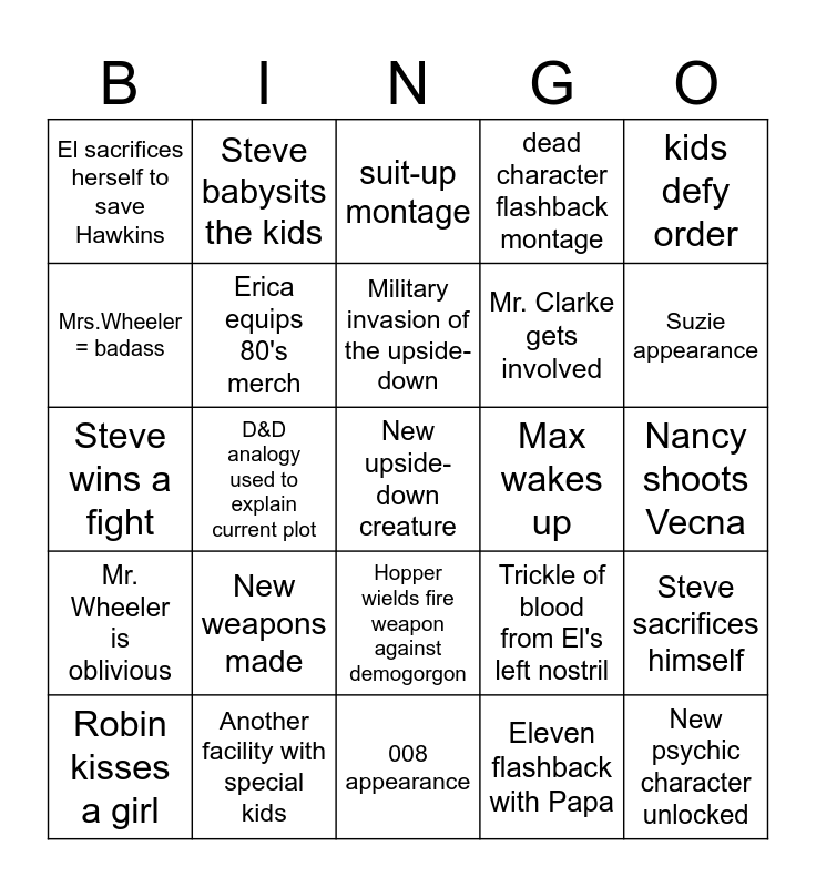 This bingo card has 25 words: New weapons made, 008 appearance, Military invasion of the upside-down, Robin kisses a girl, kids defy order, El sacrifices herself to save Hawkins, Mrs.Wheeler = badass, Steve babysits the kids, Max wakes up, Hopper wields fire weapon against demogorgon, Mr. Clarke gets involved, Steve wins a fight, Trickle of blood from El's left nostril, Steve sacrifices himself, Erica equips 80's merch, New psychic character unlocked, Nancy shoots Vecna, suit-up montage, Suzie appearance, D&D analogy used to explain current plot, New upside-down creature, Another facility with special kids, Mr. Wheeler is oblivious, dead character flashback montage and Eleven flashback with Papa.