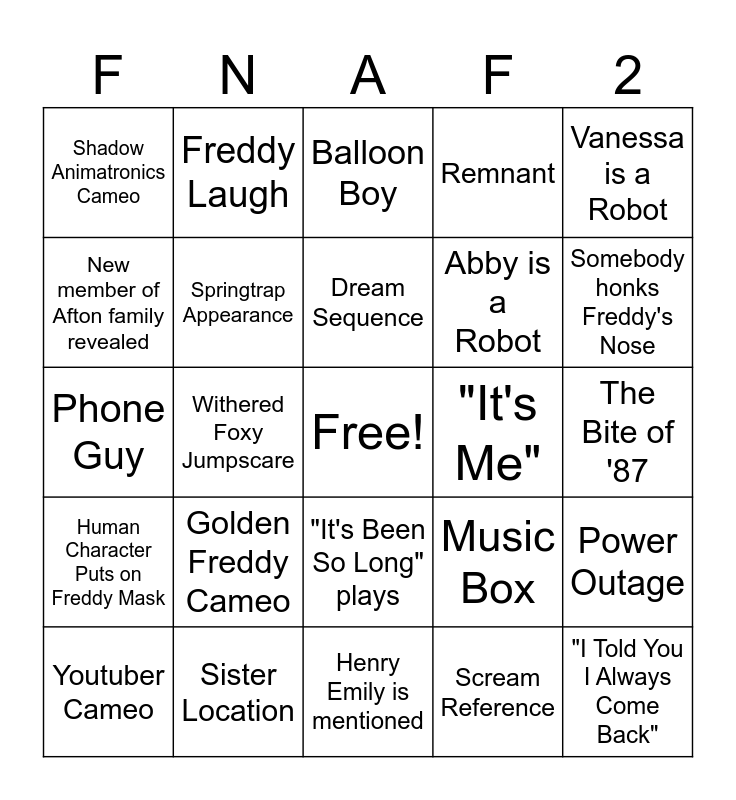 This bingo card has a free space and 29 words: Youtuber Cameo, Animatronics Have Voices, Withered Foxy Jumpscare, The Mangle Bites Someone's Hand, Shadow Animatronics Cameo, Balloon Boy, Springtrap Appearance, Golden Freddy Cameo, "It's Me", Sister Location, The Bite of '87, "I Told You I Always Come Back", Henry Emily is mentioned, Scream Reference, Somebody honks Freddy's Nose, Give Gifts, Give Life, "It's Been So Long" plays, Human Character Puts on Freddy Mask, Vanessa is a Robot, Phone Guy, Music Box, Purple Guy, Abby is a Robot, New member of Afton family revealed, Remnant, Freddy Laugh, Power Outage, Dream Sequence and Location Burns Down.