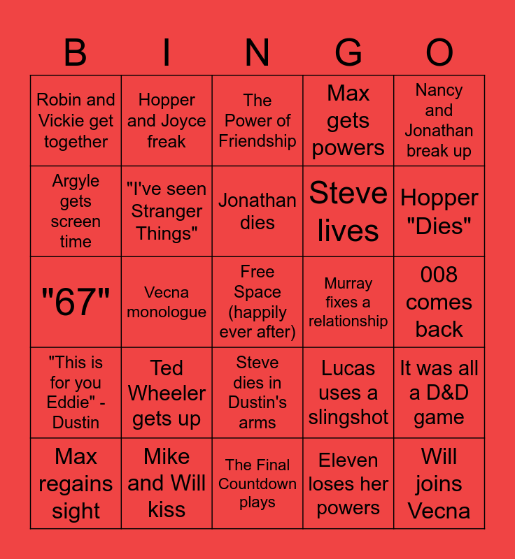 This bingo card has a free space and 24 words: Ted Wheeler gets up, Mike and Will kiss, Jonathan dies, Max regains sight, Nancy and Jonathan break up, Robin and Vickie get together, Argyle gets screen time, Hopper and Joyce freak, Murray fixes a relationship, Steve dies in Dustin's arms, Steve lives, "67", Lucas uses a slingshot, It was all a D&D game, "I've seen Stranger Things", Eleven loses her powers, 008 comes back, The Power of Friendship, Hopper "Dies", Vecna monologue, Will joins Vecna, "This is for you Eddie" - Dustin, Max gets powers and The Final Countdown plays.