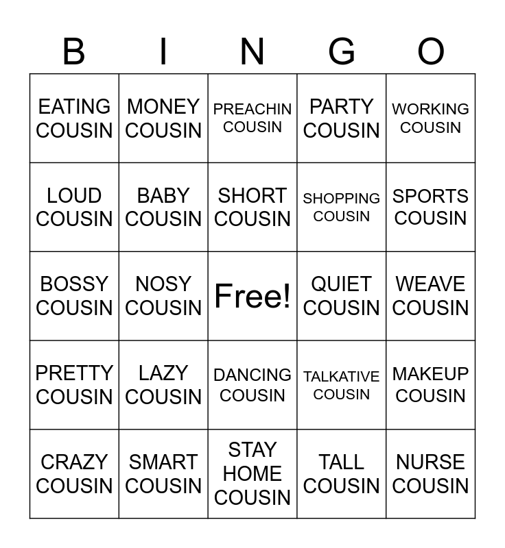 This bingo card has a free space and 24 words: CRAZY COUSIN, LAZY COUSIN, SHORT COUSIN, TALL COUSIN, WORKING COUSIN, EATING COUSIN, MONEY COUSIN, PREACHIN COUSIN, QUIET COUSIN, WEAVE COUSIN, BOSSY COUSIN, BABY COUSIN, TALKATIVE COUSIN, MAKEUP COUSIN, LOUD COUSIN, SMART COUSIN, STAY HOME COUSIN, PARTY COUSIN, SPORTS COUSIN, PRETTY COUSIN, NOSY COUSIN, DANCING COUSIN, SHOPPING COUSIN and NURSE COUSIN.