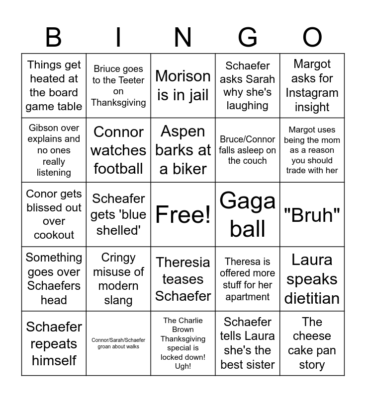 This bingo card has a free space and 36 words: "wait, wait, wait, what", 67 / "the funny number", "Wanna go on a walk?", Connor watches football, Theresa is offered more stuff for her apartment, Something goes over Schaefers head, Aspen barks at a biker, The planning is too lax, Margot asks for Instagram insight, All players team up against Gibson (Catan), Scheafer gets 'blue shelled', Schaefer asks Sarah why she's laughing, Bruce opts out of games, Gaga ball, Margot uses being the mom as a reason you should trade with her, Things get heated at the board game table, "100/zero IQ", Cringy misuse of modern slang, The cheese cake pan story, Morison is in jail, "Bruh", Laura speaks dietitian, Connor/Sarah/Schaefer groan about walks, Schaefer repeats himself, The Charlie Brown Thanksgiving special is locked down! Ugh!, Briuce goes to the Teeter on Thanksgiving, Conor gets blissed out over cookout, "Wanna play Mario cart?", Bruce/Connor falls asleep on the couch, Gibson over explains and no ones really listening, Sarah double times with the fiber arts, Dinner starts late, Schaefer tells Laura she's the best sister, Theresia teases Schaefer, Margot talks dog books and A tree falls.