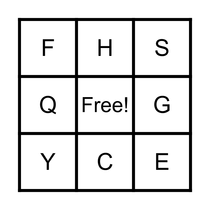 This bingo card has a free space and 26 words: A, B, C, D, E, F, G, H, I, J, K, L, M, N, O, P, Q, R, S, T, U, V, W, X, Y and Z.