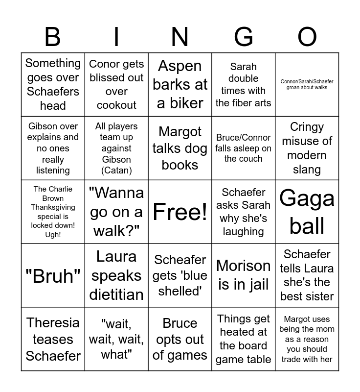 This bingo card has a free space and 30 words: "wait, wait, wait, what", 67 / "the funny number", "Wanna go on a walk?", Theresa is offered more stuff for her apartment, Something goes over Schaefers head, Aspen barks at a biker, All players team up against Gibson (Catan), Scheafer gets 'blue shelled', Schaefer asks Sarah why she's laughing, Bruce opts out of games, Gaga ball, Margot uses being the mom as a reason you should trade with her, Things get heated at the board game table, "100/zero IQ", Cringy misuse of modern slang, The cheese cake pan story, Morison is in jail, "Bruh", Laura speaks dietitian, Connor/Sarah/Schaefer groan about walks, The Charlie Brown Thanksgiving special is locked down! Ugh!, Briuce goes to the Teeter on Thanksgiving, Conor gets blissed out over cookout, Bruce/Connor falls asleep on the couch, Gibson over explains and no ones really listening, Sarah double times with the fiber arts, Schaefer tells Laura she's the best sister, Theresia teases Schaefer, Margot talks dog books and A tree falls.