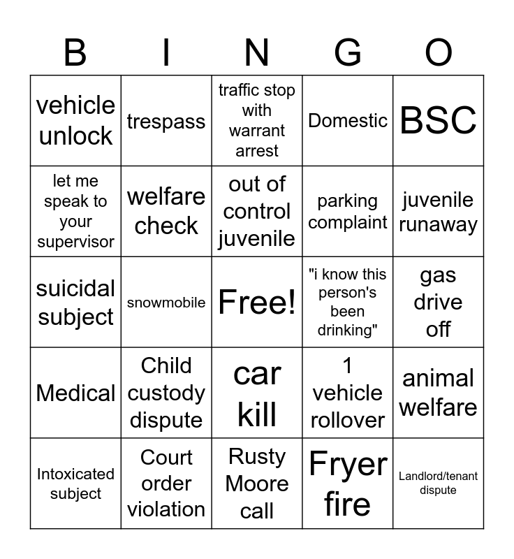 This bingo card has a free space and 24 words: Child custody dispute, Court order violation, out of control juvenile, Intoxicated subject, BSC, vehicle unlock, let me speak to your supervisor, trespass, "i know this person's been drinking", car kill, parking complaint, suicidal subject, 1 vehicle rollover, animal welfare, welfare check, Fryer fire, gas drive off, traffic stop with warrant arrest, juvenile runaway, snowmobile, Landlord/tenant dispute, Medical, Domestic and Rusty Moore call.