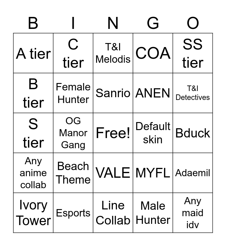 This bingo card has a free space and 24 words: Beach Theme, Esports, Sanrio, Ivory Tower, SS tier, A tier, B tier, C tier, Default skin, VALE, ANEN, S tier, MYFL, Adaemil, Female Hunter, Male Hunter, Bduck, T&I Melodis, T&I Detectives, OG Manor Gang, Any maid idv, Any anime collab, COA and Line Collab.