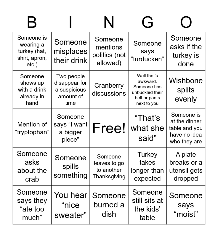 This bingo card has a free space and 24 words: Someone spills something, You hear “nice sweater”, Cranberry discussions, Someone says they “ate too much”, Someone asks if the turkey is done, Someone is wearing a turkey (hat, shirt, apron, etc.), Someone shows up with a drink already in hand, Someone misplaces their drink, “That’s what she said”, Someone leaves to go to another Thanksgiving, Well that's awkward. Someone has unbuckled their belt or pants next to you, Mention of “tryptophan”, Turkey takes longer than expected, A plate breaks or a utensil gets dropped, Two people disappear for a suspicious amount of time, Someone still sits at the kids’ table, Someone is at the dinner table and you have no idea who they are, Someone mentions politics (not allowed), Wishbone splits evenly, Someone says “I want a bigger piece”, Someone says “moist”, Someone asks about the crab, Someone says “turducken” and Someone burned a dish.