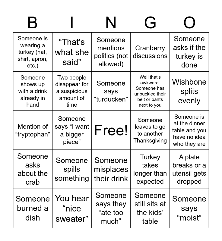 This bingo card has a free space and 24 words: Someone spills something, You hear “nice sweater”, Someone says “turducken”, Someone burned a dish, Someone asks if the turkey is done, Someone is wearing a turkey (hat, shirt, apron, etc.), Someone shows up with a drink already in hand, “That’s what she said”, Someone leaves to go to another Thanksgiving, Someone misplaces their drink, Well that's awkward. Someone has unbuckled their belt or pants next to you, Mention of “tryptophan”, Turkey takes longer than expected, A plate breaks or a utensil gets dropped, Two people disappear for a suspicious amount of time, Someone still sits at the kids’ table, Someone is at the dinner table and you have no idea who they are, Someone mentions politics (not allowed), Wishbone splits evenly, Someone says “I want a bigger piece”, Someone says “moist”, Someone asks about the crab, Cranberry discussions and Someone says they “ate too much”.