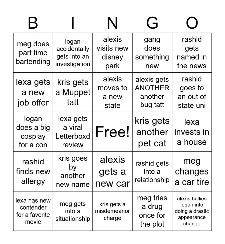 This bingo card has a free space and 24 words: kris goes by another new name, meg gets into a situationship, alexis moves to a new state, lexa has new contender for a favorite movie, rashid gets named in the news, meg does part time bartending, lexa gets a new job offer, logan accidentally gets into an investigation, kris gets another pet cat, alexis gets a new car, alexis gets ANOTHER another bug tatt, logan does a big cosplay for a con, rashid gets into a relationship, meg changes a car tire, kris gets a Muppet tatt, meg tries a drug once for the plot, lexa invests in a house, alexis visits new disney park, rashid goes to an out of state uni, lexa gets a viral Letterboxd review, alexis bullies logan into doing a drastic appearance change, rashid finds new allergy, gang does something new and kris gets a misdemeanor charge.