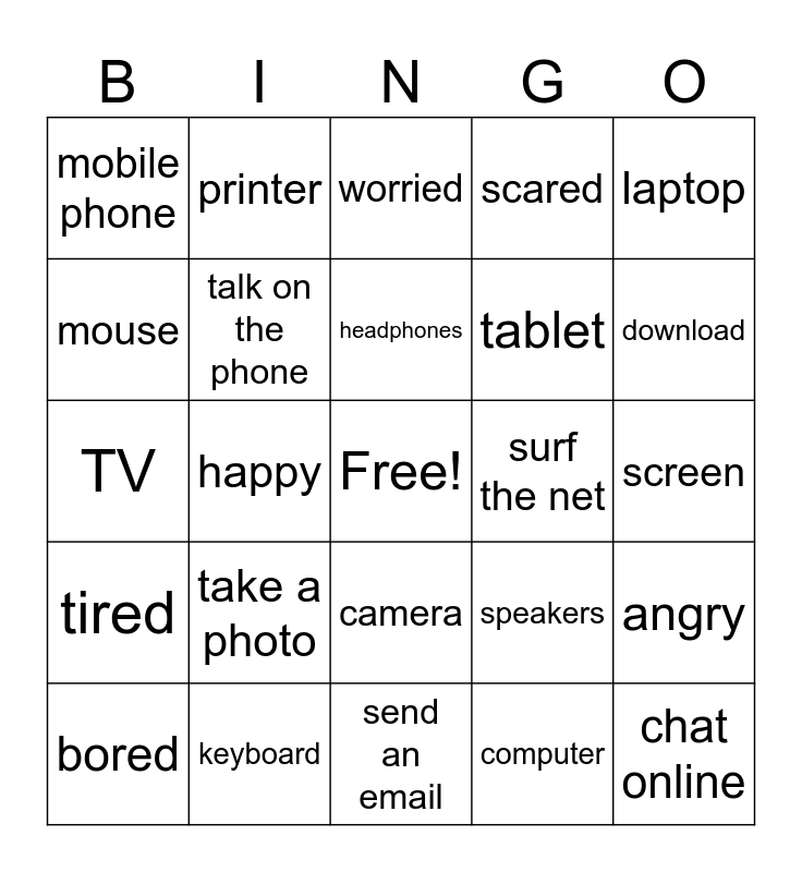 This bingo card has a free space and 26 words: camera, computer, headphones, keyboard, laptop, mobile phone, mouse, printer, screen, speakers, tablet, TV, angry, bored, happy, sad, scared, tired, worried, chat online, download, send an email, surf the net, take a photo, talk on the phone and text a friend.