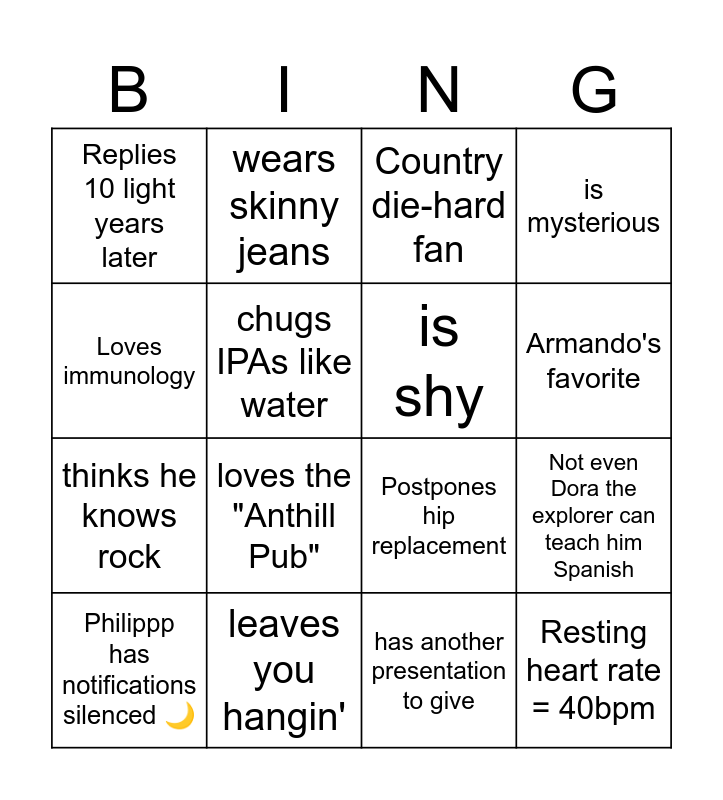 This bingo card has 16 words: leaves you hangin', Not even Dora the explorer can teach him Spanish, Country die-hard fan, Replies 10 light years later, thinks he knows rock, wears skinny jeans, Postpones hip replacement, has another presentation to give, Loves immunology, chugs IPAs like water, Philippp has notifications silenced 🌙, is mysterious, loves the "Anthill Pub", Armando's favorite, is shy and Resting heart rate = 40bpm.